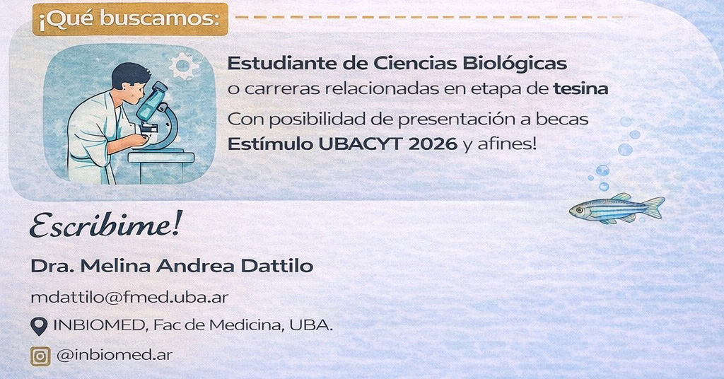 Noticias / Nueva Búsqueda: Tesinista en Biología Molecular INBIOMED - CIENCIAS BIOLÓGICAS Y DE LA SALUD Nueva Búsqueda: Tesinista en Biología Molecular 9 de abril de 2026 Compartir en redes socialesCompartir en FacebookCompartir en Twitter Publicado el 9 de abril de 2026 Tags:CONICET INBIOMED Melina Dattilo TESINISTA uba Nueva Búsqueda: Tesinista en Biología Molecular Dra. Melina Andrea Dattilo mdattilo@fmed.uba.ar CompartirCompartir en FacebookCompartir en Twitter
